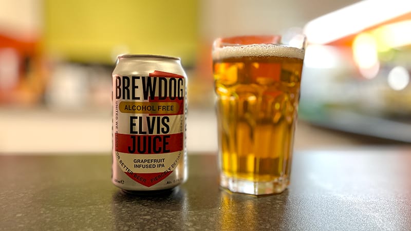 How Brewdog describes Elvis Juice: This U.S. AF exclusive has all of the grapefruit treble notes of his stronger sibling, Elvis Juice [w/alc]. Followed by a chorus of orange and pine, loud citrus flavors groove on a solid malt base foundation, giving the hop aromas a stage to shine for an all-night show.