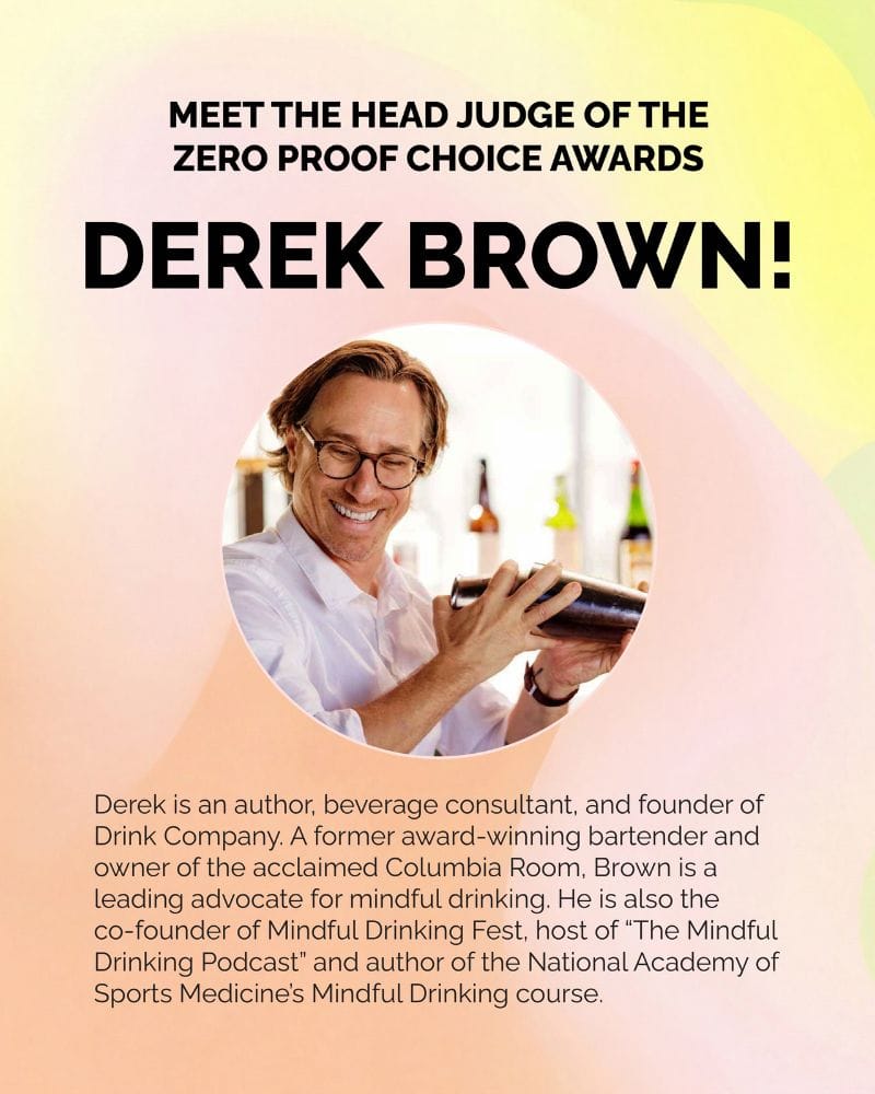 We’re thrilled to have Derek as a judge for the Zero Proof Choice Awards, alongside other NA industry experts such as Lynnette Marrero, LP O’Brien, and Laura Silverman.