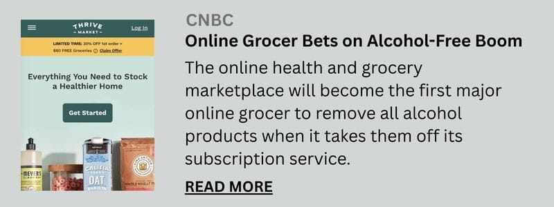 The online health and grocery store Thrive Market has removed all alcohol products from its marketplace. In their place, they’re now offering more than 100 SKUs from 20 non-alcoholic brands.