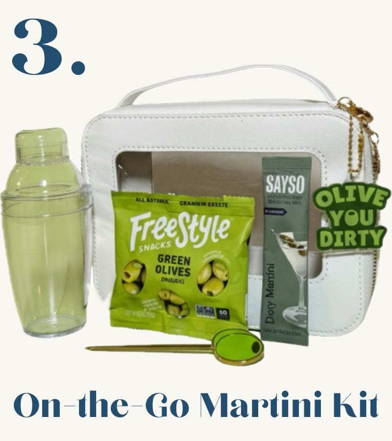 The white travel kit includes six Martini sticks, olive pouches, a small cocktail shaker, cocktail picks, and a bunch of other fun goodies.